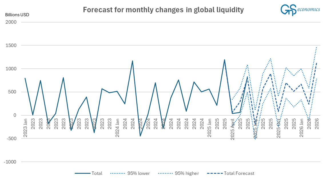 Today, I will provide simple time series forecasts for the global liquidity (money supply) flows. Yesterday, I realized that we also need to further develop the forecasts by adding more countries, but that is long process. Figure 1 shows how our forecasts performed.