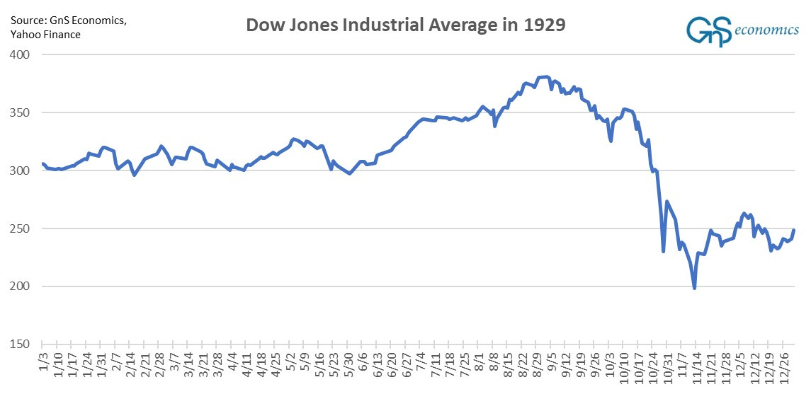 What happened to stock markets after August 1929, is the worrying part. In 1929, the first hints of a slowing economy came in July, when the index of industrial production of the Fed dropped (there were, e.g., no quarterly earnings reports). From then on, several other indices, including steel production and freight-car loads, started falling. The mix of bad news and rising interest rates foretold on upcoming recession, and the markets started to drift downwards in early September. Between 24-29 October, the U.S. stock markets crashed by 29%.