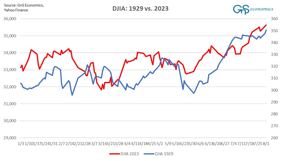Relating to this, we found a worrying correlation in the historical patterns of stock markets. The recent ‘bull run’ in asset markets has followed that of 1929 with notable accuracy. The correlation of daily moves of the Dow Jones Industrial Average (DJIA) between 1929 and 2023 56%. This is a very high correlation for time series following stochastic processes (with time trends).1