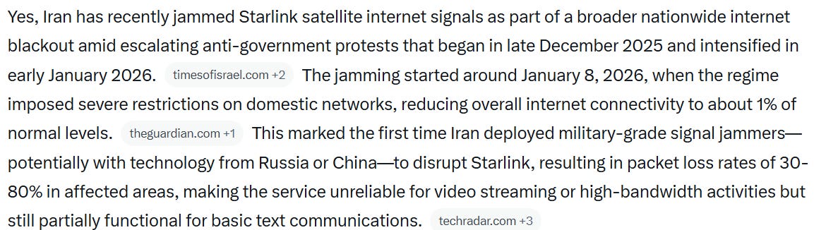 As an interesting twist, a journalist reported in X that Iran would have effectively decapitated Starlink over Iran using Chinese tech. A search by Grok found multiple sources stating that this would have happened,1 and I am not surprised. I have long suspected that Beijing will be forced to start to draw a line in the sand on how far it allows the Trump administration to go in its meddling with allies crucial to the energy security of China. This holds especially now after the coup in Venezuela. The jamming could have been one factor behind the backing down of the ‘Trump-Netanyahu clique.’