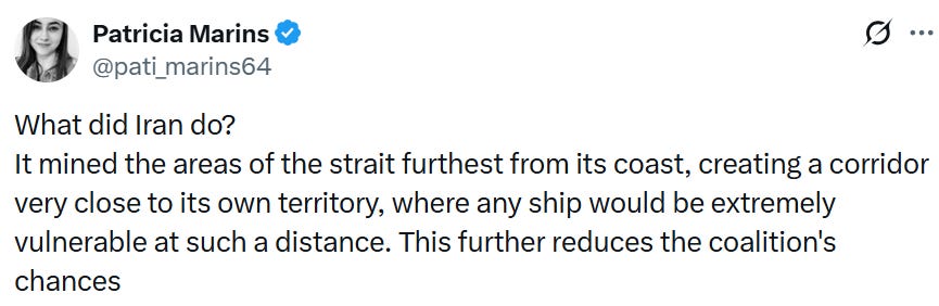 This is precisely what I, as a trained group leader (under-sergeant) of an armored engineer company (in my mandatory military service), would do. Mine the route that is closest to our positions. If you think that any coalition President Trump is building can open the Strait, I urge you to read the piece Patricia wrote for us on the eve of the onset of the war of Iran’s naval capabilities.