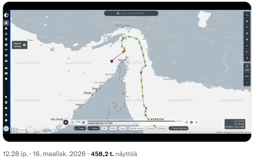 In the matters concerning reality, the first non-Iranian oil tanker, Karachi, has safely passed the Strait. The X account of Marine Traffic reports: