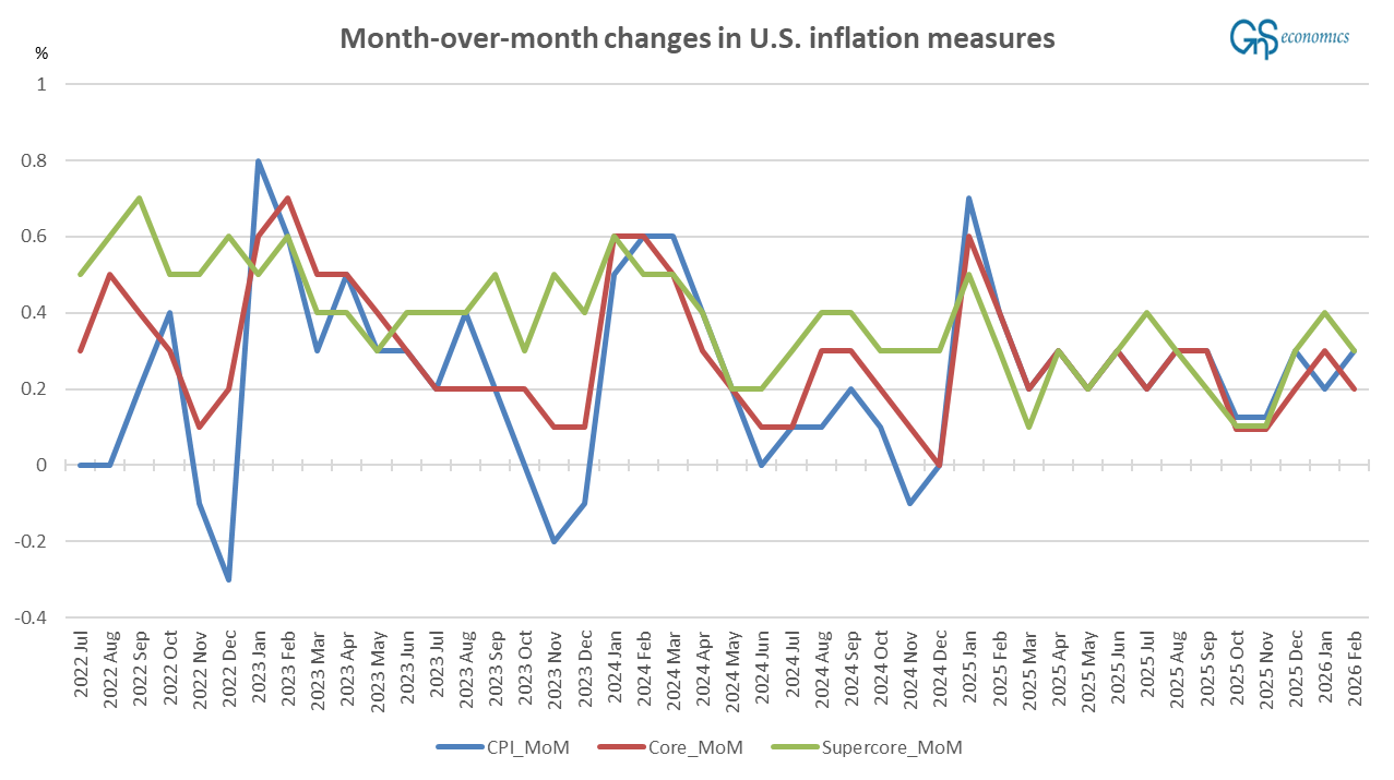 Let’s first check how our inflation forecasts from the past month fared. In February, the Consumer Price Index (all items, all urban consumers, U.S. city average, seasonally adjusted), or CPI, rose by 2.4% annualized, 0.3% month-over-month (MoM). The core inflation rose by 2.5% annualized and 0.2% MoM. The “super-core,” i.e., services less energy costs, rose by 2.9% annualized, 0.3% MoM.