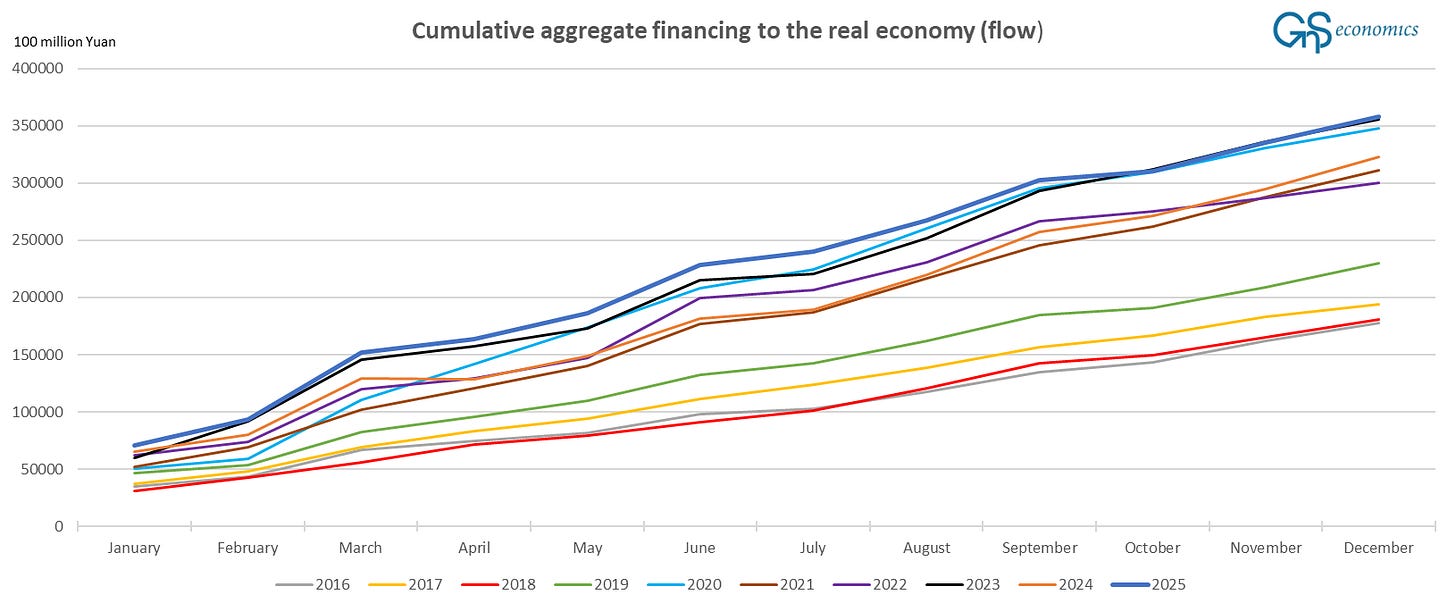 The accumulated flow of financing to the Chinese economy reached CNY 35.784 trillion in 2025, surpassing the previous record of CNY 35.569 set in 2023. In December, the flow of credit entering the Chinese economy grew by CNY 2,210 billion, which was clearly below the December record of CNY 2,851 billion set in 2024. Still, the December flow of financing was the third highest since our records began (2012). Our forecast for the flow of financing from the past month (in natural logarithms) was accurate, as shown by the figure below.