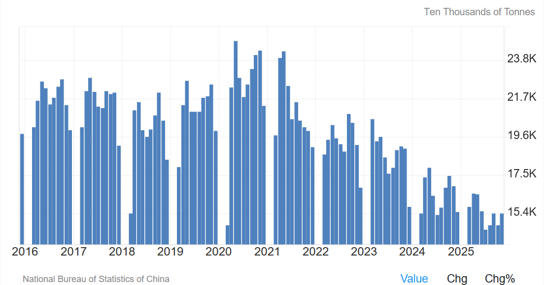 What you notice is a steady decline in the cement production starting in around mid-January 2021. However, like we noted in Weekly Forecasts 10/2025, the forecasting ability of the cement production has declined because Beijing has directed funding away from the real estate sector, which has reached a state of collapse as a result.