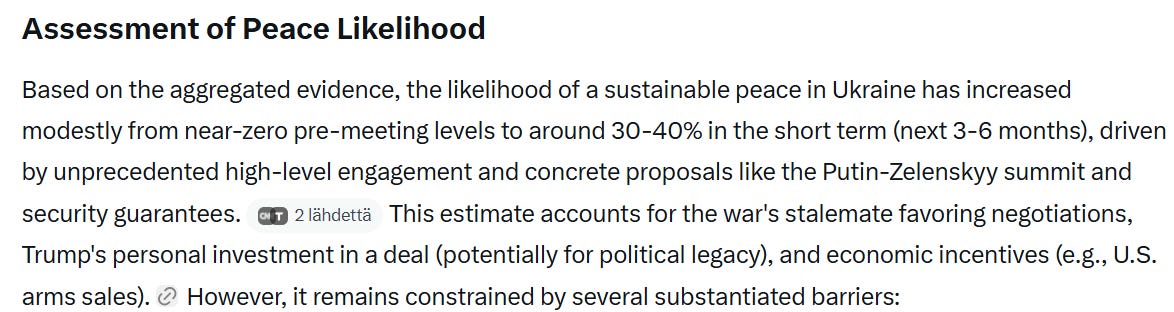 This is how Grok 4 saw the likelihood of a peace on Tuesday, August 19, at 11:30 am Helsinki-time.