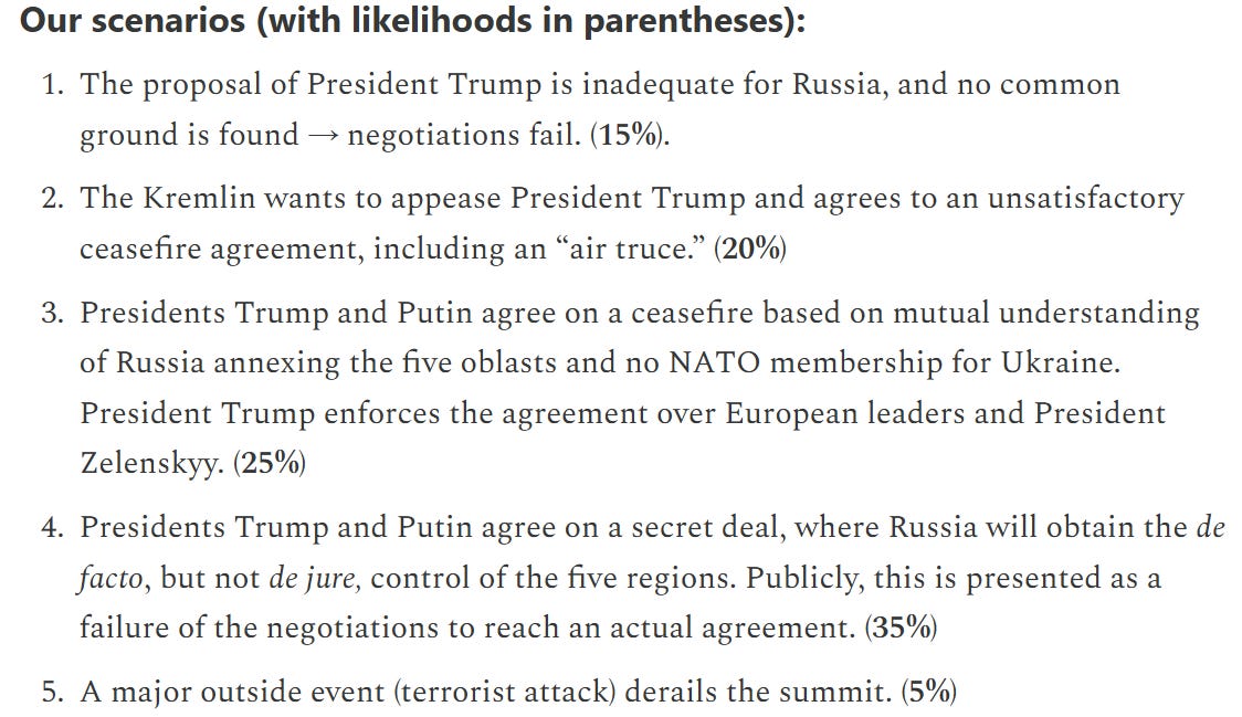 We start this week’s forecasts by assessing the scenarios we and Grok 4 AI presented a week ago for the meeting between President Trump and Putin. We wanted to test how an untrained AI copes with a task with high uncertainties. Results were mixed, heavily. We wanted to test (an untrained) AI and also to warn you about relying on AI (large language models) in analysis and forecasting work. They are magnificent assistants but untrustworthy masters. After this we turn to providing the analysis and likelihood for peace in Ukraine.